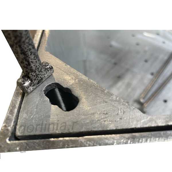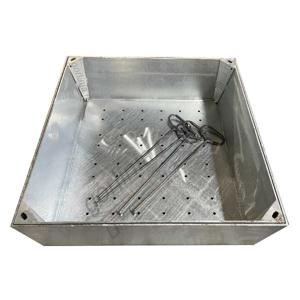 Изделие изготовлено из чернового проката 5мм с покрытием методом горячего цинкования в ваннах с расплавом цинка. Снизу в дне вырезаны дренажные отверстия D10 с шагом 70-100 мм для отвода вод от полива газонного покрытия и осадков.