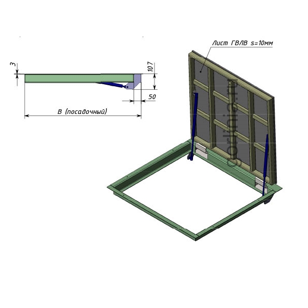 Облегченная рама из листового проката 3 мм с наличником, монтажная глубина 60, в зоне механизма 107 мм. Каркас полотна с обвязкой сварен из трубы 30х20, заполнен ГВЛ под чистовую отделку.
