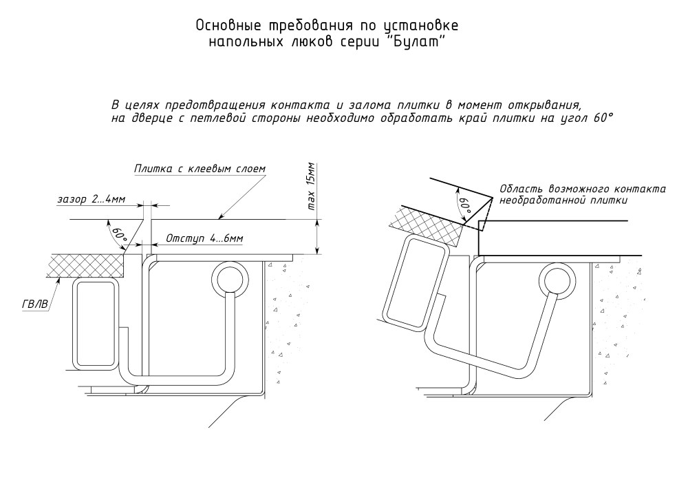 Облегченная модель прямоугольного размера без щелей в полу со смещенными за ось открывания петлями через вырезанные в раме ниши. Легкая ходовая часть на амортизаторах и удобный монтаж с облицовкой крышки керамическим или ламинированным покрытием.