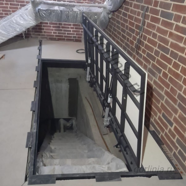 Решающую роль сыграла услуга замера и установки, когда конструкторы получили необходимую информацию и в кооперации с монтажниками разработали проект двухсекционной рамы с продольным "глухарем" со стороны петель и дополнительно примыкающей глухой частью, заполняющей собой оставшийся проем. Замерщик заложил в конструкцию монтажные полосы и посадочные уголки по контуру для удобства крепления коробки, предложил разместить опорные стойки по оси открывания створки.С учетом фактических размеров марша лестницы заказчик согласился уменьшить ширину пролета люка в свету с 1080 до 775 мм, поэтому дверь осталась в размерных допусках для корректной работы актуаторов и догрузов газовыми амортизаторами под вес керамогранита.
