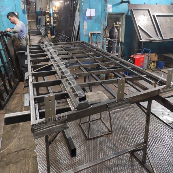 "Сложно было попасть в скошенный угол, поэтому повторно выехали на место для промера сторон и диагоналей по готовому чертежу. При планировании размера и траектории хода створки учитывали конфигурацию марша на второй этаж - ступени также смещены на 8°. Сопряженные секции скрепили намертво четырьмя винтами. Сначала поставили дальнюю глухую часть. Основная рама легла на 2 язычка вспомогательной с 3-мя опорными стойками из профиля 50х50 по петлевой балке".